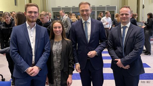 vlnr.: Jannes Kuhlmann (BDZ), Michelle Hartlieb (BDZ), Bundesfinanzminister Christian Lindner, Marco Sendner (BDZ)