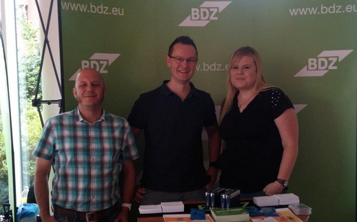 Am 25. August 2015 präsentierte sich der BDZ beim Bildungs- und Wissenschaftszentrum (BWZ) der Bundesfinanzverwaltung in Münster mit einem Info-Stand. Es wurden Fragen der Nachwuchskräfte beantwortet und Anregungen für die bevorstehende Ausbildung gegeben. Als Team für die örtliche Betreuung der Nachwuchskräfte am Ausbildungsstandort Münster standen hierbei Steffen Knaak und Sebastian Teßmer (beide stellvertretende Vorsitzende des BDZ-Bezirksverbands Westfalen) sowie Daniela Lüffe (Bezirksjugendleiterin des BDZ-Bezirksverbands Westfalen) v.l., den Studierenden des Grundstudiums und des Hauptstudiums I (einschließlich des neuen Studiengangs V-IT) für deren offene Fragen rund um die Ausbildung beziehungsweise das Studium zur Verfügung.