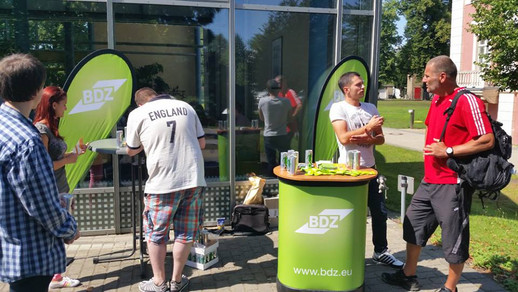 Am 20. August hat die BDZ-Jugend, vertreten durch Demis Wibbeke, Georg Zörner und Claudia Preuss, den Info-Stand vor der Mensa des BWZ Plessow aufgebaut. Bei strahlendem Sonnenschein wurden die Anwärterinnen und Anwärter auf dem Weg zur Mittagspause bzw. nach dem Essen mit Getränken und Informationen versorgt.
