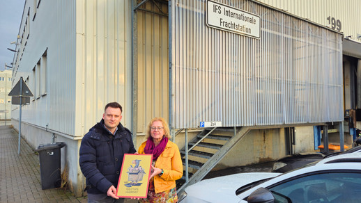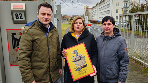 Thomas Liebel (HPR und Bundesvorsitzender) überreicht das Schild für die verlotterte Liegenschaft an die örtlichen BDZ-Personalräte Julia Rabenstein und Ingo Mandel am GZD-Dienstsitz in Berlin-Karlshorst