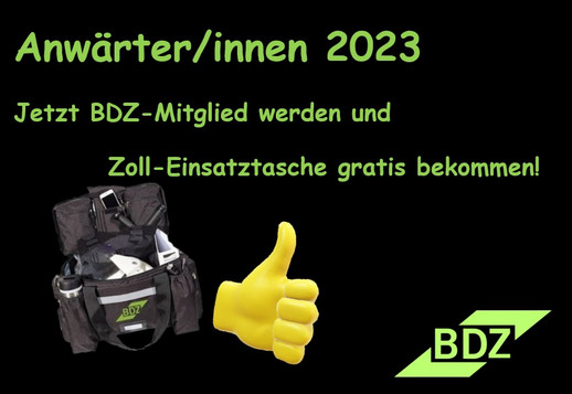 Der BDZ ist die repräsentative Fachgewerkschaft in der Zollverwaltung für alle Zöllnerinnen und Zöllner und vertritt deren Interessen und Forderungen. Wir würden uns freuen, Dich auch bald als Mitglied im BDZ begrüßen zu dürfen. Als Begrüßungsgeschenk erhältst Du die praktische Einsatztasche.