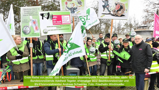 • Erste Reihe von rechts: dbb Fachvorstand Beamtenpolitik Friedhelm Schäfer, stellv. BDZ Bundesvorsitzende Adelheid Tegeler, ehemaliger BDZ-Bezirksvorsitzender und BV-Ehrenvorsitzender Andreas Schwenke. Foto: Friedhelm Windmueller