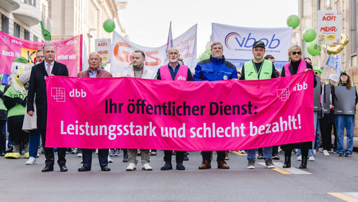 Sie forderten kurz vor der dritten und entscheidenden Verhandlungsrunde unter anderem mehr Zeitsouveränität und eine zukunftsfeste Personalpolitik. dbb-Verhandlungsführer Volker Geyer ließ das Arbeitgeber-Argument der leeren Kassen nicht gelten und verwies auf Rekord-Steuereinnahmen, die in Bund und Ländern mittlerweile auf eine Billion Euro pro Jahr gestiegen sind. „Es sind die Kolleginnen und Kollegen in vielen Sparten des öffentlichen Dienstes, die diese Einnahmen überhaupt erst möglich machen. Belohnt werden sie dafür mit Personalmangel, Arbeitsverdichtung und Arbeitsbedingungen von gestern. Das lassen wir uns nicht länger bieten“, sagte Geyer auf der Abschlusskundgebung vor dem Bundesministerium des Innern. Bundesinnenministerin Nancy Faeser forderte er auf, ihren noch im Januar auf der Jahrestagung des dbb anvisierten Kurs, „einen Interessenausgleich zu finden, ohne den Pfad des Konstruktiven zu verlassen“, endlich in die Tat umzusetzen. Geyer: „Frau Faeser, das sind sie den Kolleginnen und Kollegen schuldig!“
