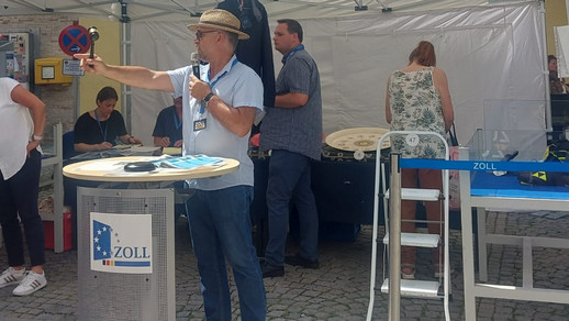 Bei sonnigem Wetter war das Hauptzollamt Rosenheim am 6. Juli beim diesjährigen Stadtfest in Bad Reichenhall vertreten. Ab 10:00 Uhr erhielten die Besucher Informationen über die Arbeit des Zolls, unter anderem zur Schwarzarbeitsbekämpfung, zur Warenabfertigung und zur Kontrolle im Reiseverkehr. Hier lag das Augenmerk auf die sogenannten "Urlaubsmitbringsel" und den Artenschutz. Auch über die Möglichkeiten einer Ausbildung beim Zoll konnten sich die Besucher informieren. Großes Interesse fand die öffentliche Versteigerung von gepfändeten Gegenständen, die vorab besichtigt werden konnten.*