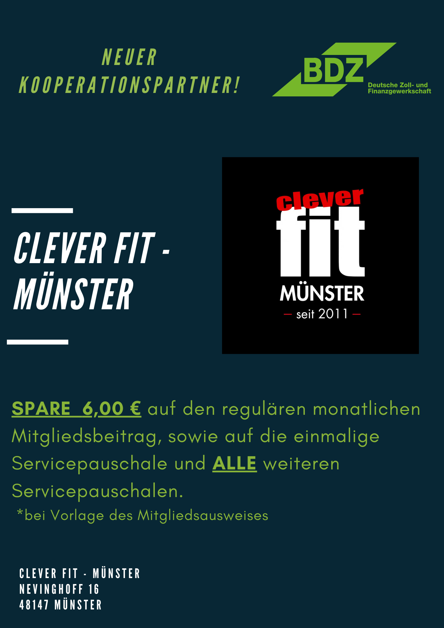 Als BDZ Mitglied erhälst du bei cleverfit in Münster einen Preisnachlass von 6,00€ auf den regulären monatlichen Mitgliedsbeitrag! Die einmalige und alle weiteren Service-Pauschalen entfallen auch.