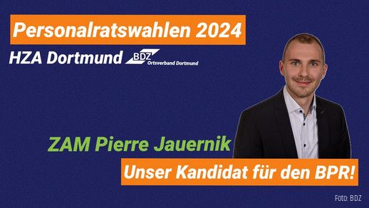 Am 23. April 2024 wird der Bezirkspersonalrat neu gewählt. Pierre Jauernik kandidiert auf Listenplatz 18 für ein Mandat in der Beamtengruppe. Er ist seit 2013 BDZ-Mitglied und beim HZA Dortmund im Sachgebiet B tätig.