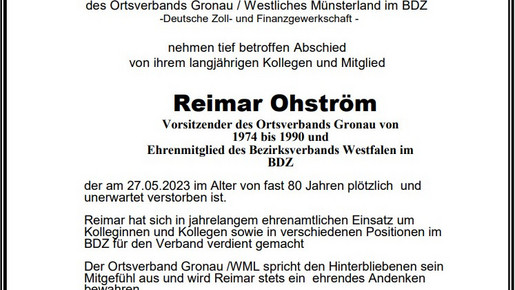 Die Kolleginnen und Kollegen des Ortsverband Gronau/Westliches Münsterland nehmen tief betroffen Abschied von ihrem langjährigen Kollegen und BDZ-Mitglied Reimar Ohström.